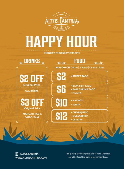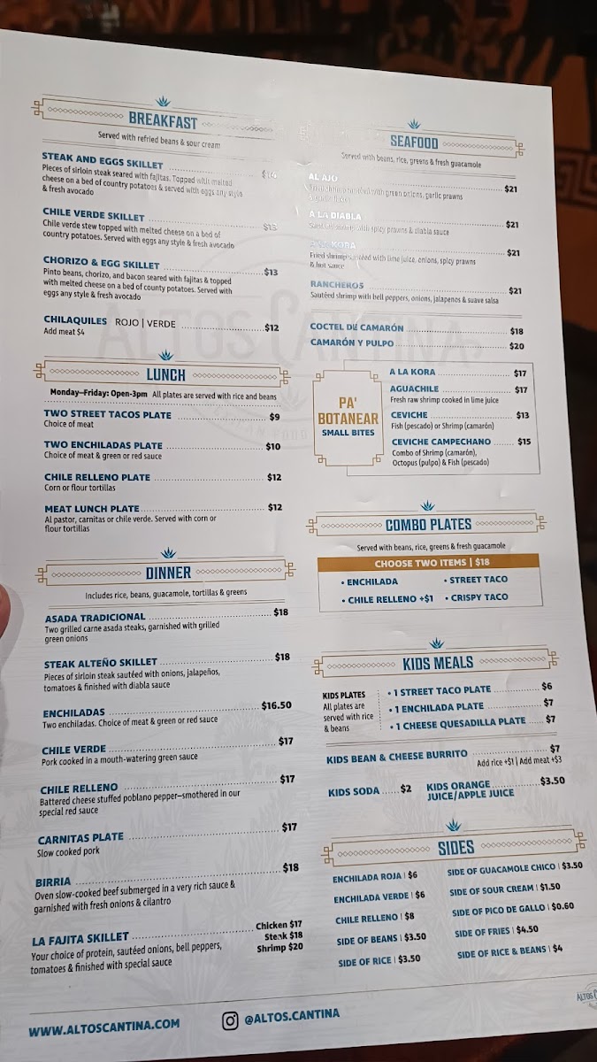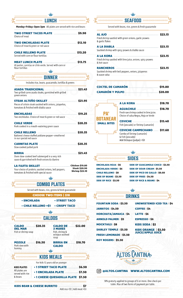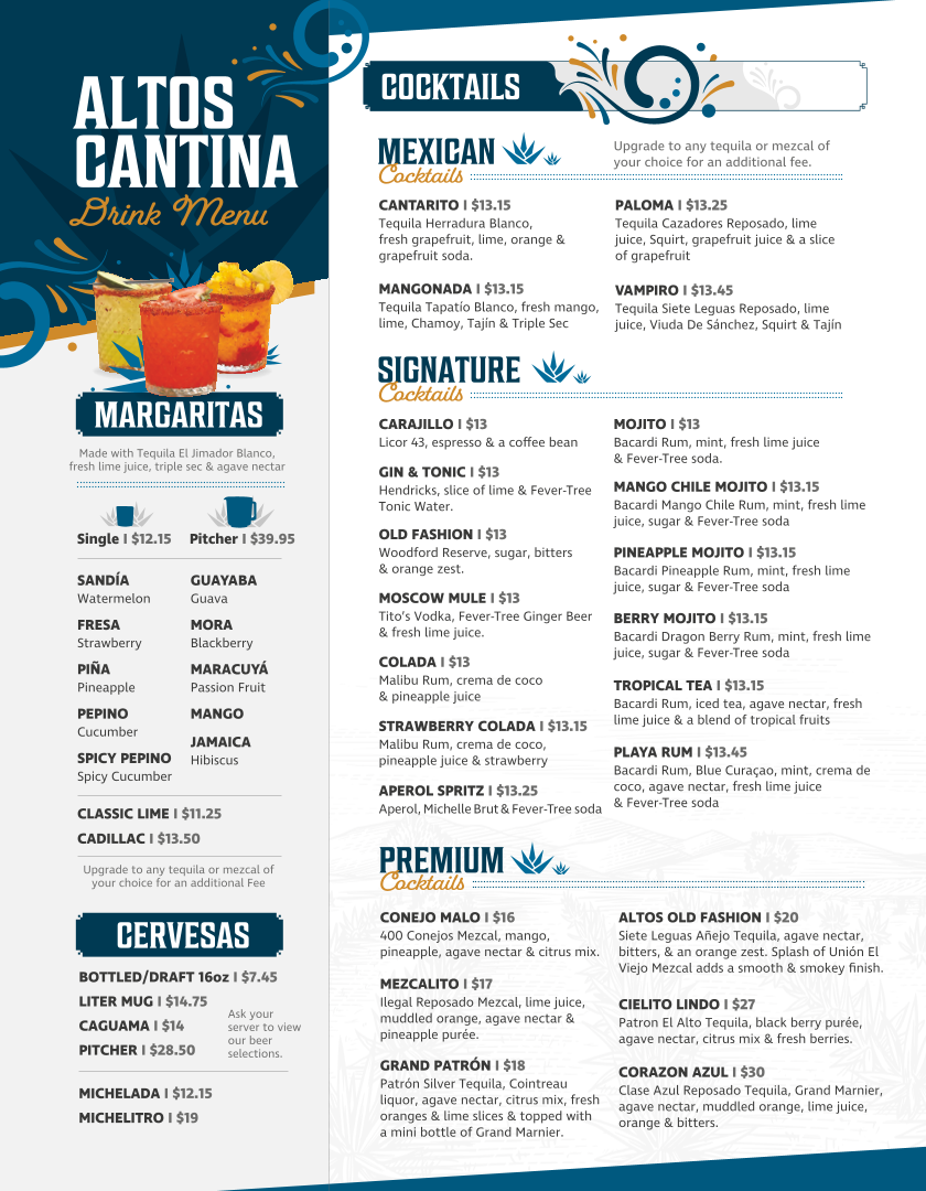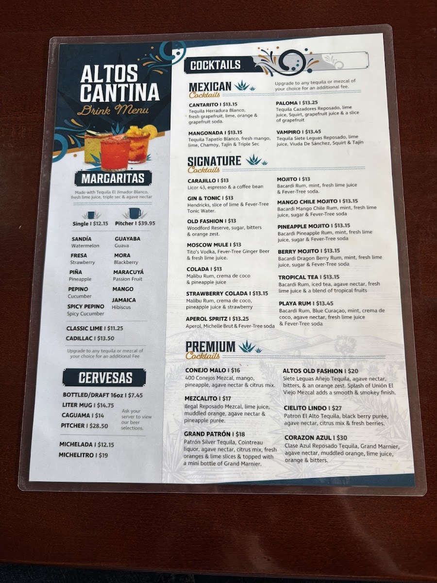 The menu at Altos Cantina offers a delightful mix of Mexican-inspired cocktails, margaritas, and beers. For those seeking a refreshing start, the Cantarito and Mangonada from the Mexican cocktail section are popular choices, each offering a burst of tropical flavors. If you're in the mood for something with a kick, the Carajillo signature cocktail provides a bold coffee-infused twist. Altos Cantina also features a variety of margaritas, such as the vibrant Sandía, tangy Guayaba, fruity Fresamora, and the sweet and tropical Piña. When it comes to beer, patrons can choose from a range of bottled and draft options, available in 16oz, Liter Mug, and Caguama sizes, catering to all preferences. If you’re in the mood for something a bit spicier, a Michelada is also on the menu. This array of drinks, from classic margaritas to bold cocktails, promises something for everyone at Altos Cantina.