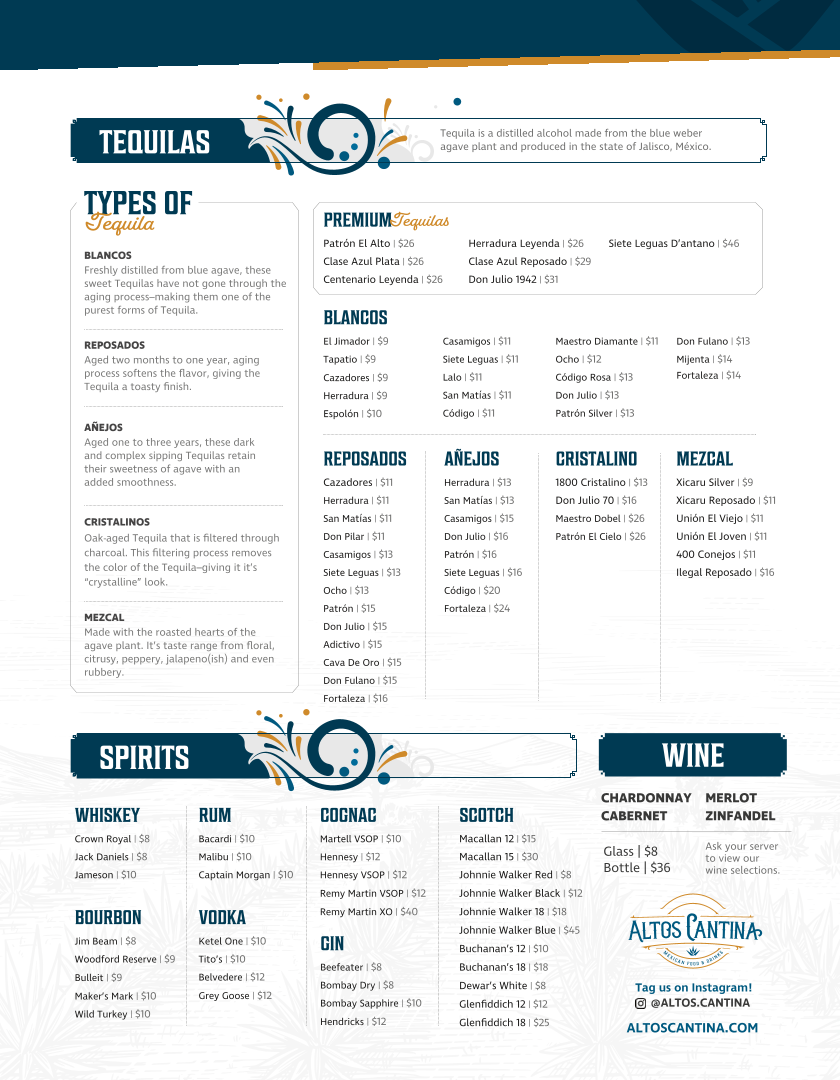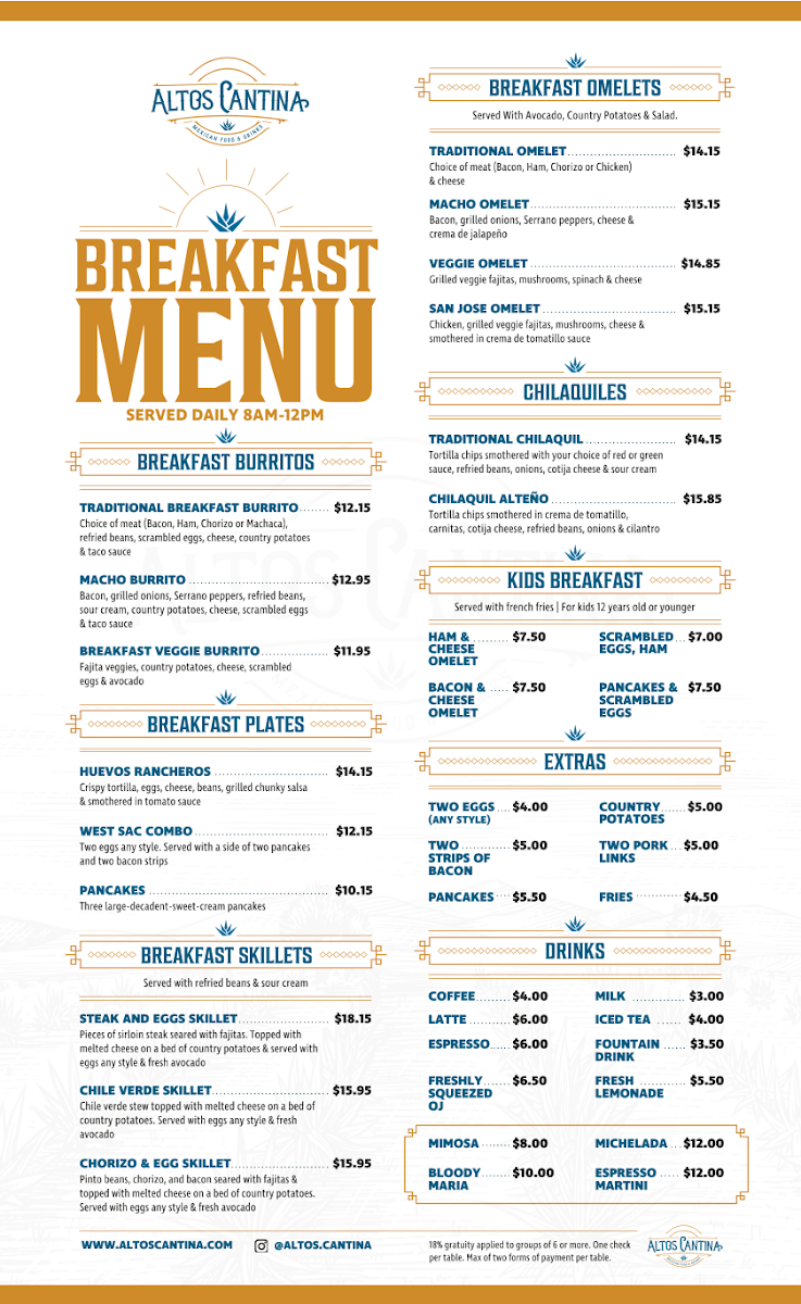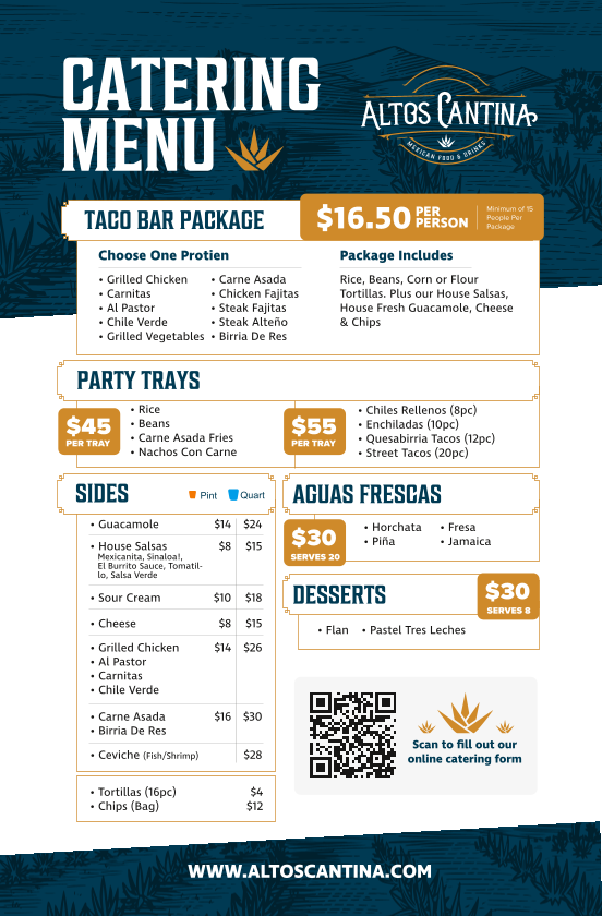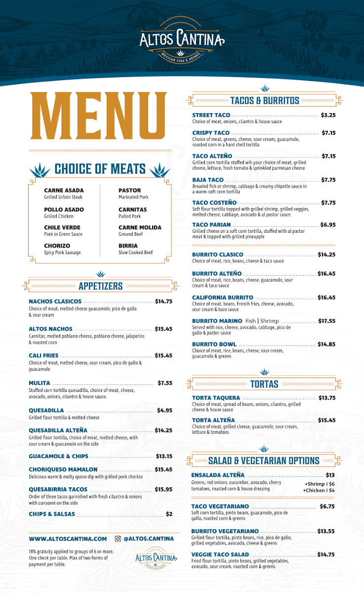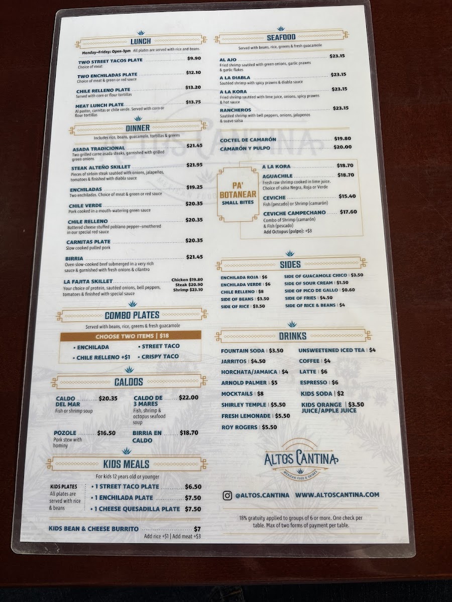 The menu at Altos Cantina offers a delightful mix of Mexican-inspired cocktails, margaritas, and beers. For those seeking a refreshing start, the Cantarito and Mangonada from the Mexican cocktail section are popular choices, each offering a burst of tropical flavors. If you're in the mood for something with a kick, the Carajillo signature cocktail provides a bold coffee-infused twist. Altos Cantina also features a variety of margaritas, such as the vibrant Sandía, tangy Guayaba, fruity Fresamora, and the sweet and tropical Piña. When it comes to beer, patrons can choose from a range of bottled and draft options, available in 16oz, Liter Mug, and Caguama sizes, catering to all preferences. If you’re in the mood for something a bit spicier, a Michelada is also on the menu. This array of drinks, from classic margaritas to bold cocktails, promises something for everyone at Altos Cantina.